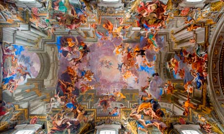 The church of illusions was built between 1626 and 1650 and dedicated to Ignatius of Loyola. The trompe l’oeil ceiling mural by Andrea Pozzo uses foreshortening to create a realistic vision of the founder of the Society of Jesus soaring towards paradise to be welcomed by Christ. A disk in the floor marks the ideal spot from which to experience the illusion.