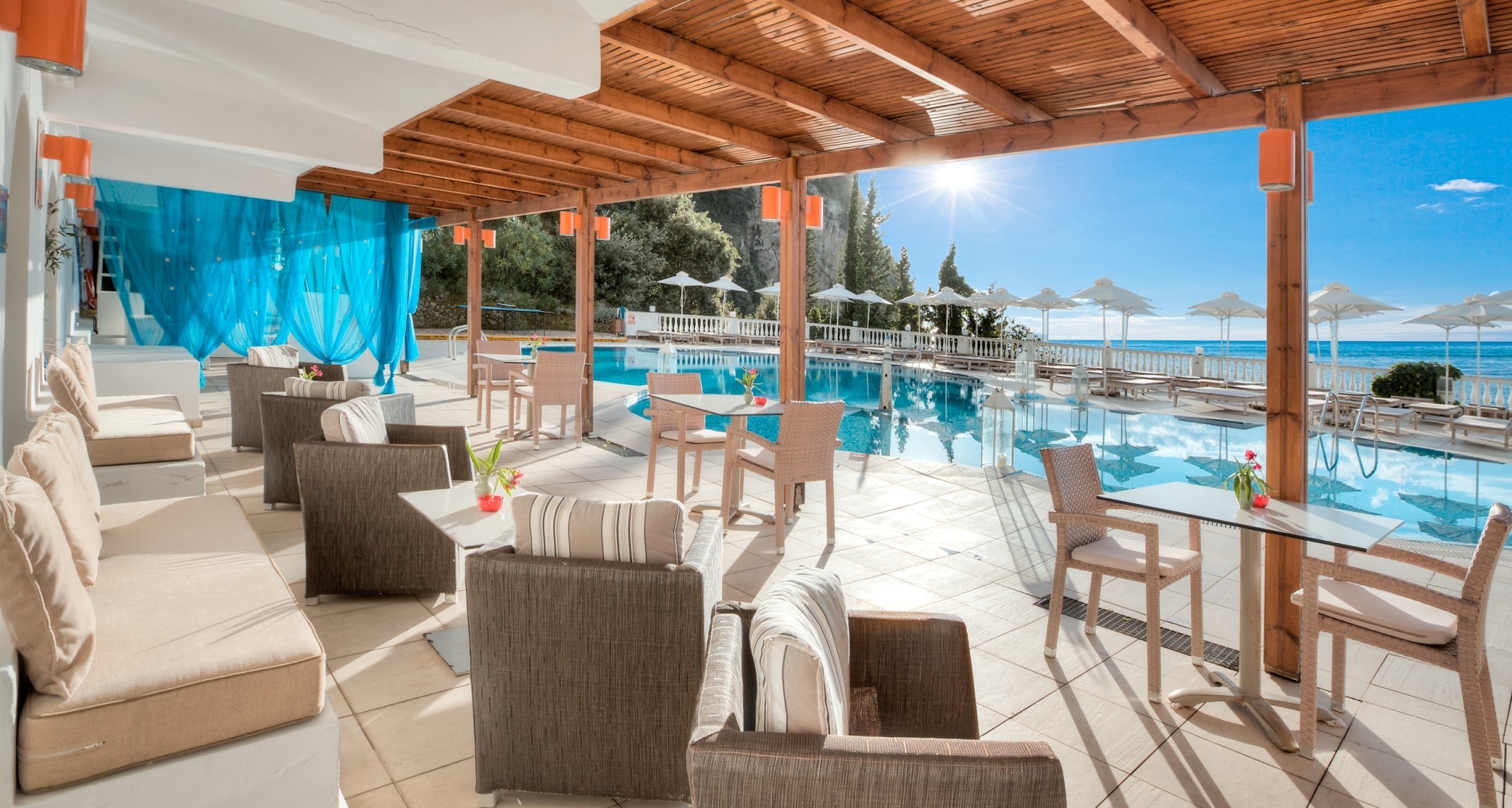 Aquis Agios Gordios Hotel – Adults only is an extremely exquisite adults only hotel. It is fully reconstructed and renovated in order to achieve superior standards. Holding an ideal location by the best beach in Corfu creates the perfect environment for dreamlike holidays. Situated right above a stunning sandy beach surrounded by green rocky mountains and set amidst lush tropical gardens, the waterfront resort offers divine views of the surrounding sea and mountain scenery. It is possibly the most picturesque hotel on the island and the setting has been a long time favorite as a postcard backdrop. The resort boasts a sophisticated ambiance, a large lagoon style swimming pool, a restaurant with a great variety of local and international cuisine including a special Sushi blend, a bar with live music and shows and a wonderful beach bar. The property consists of 246 rooms, all fully renovated and nicely decorated to deluxe standards targeting the up market clientele within an adult only quiet and elegant environment with private balconies overlooking the Ionian Sea and a wide assortment of amenities to provide to its guests a comfortable stay within a luxurious surrounding.