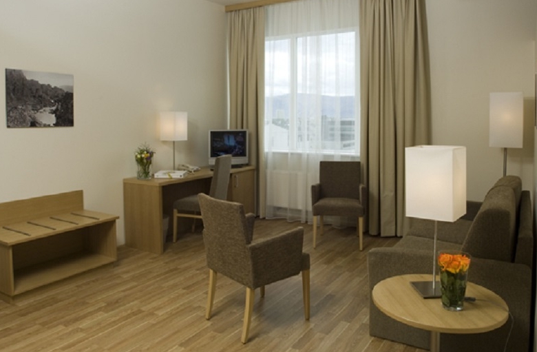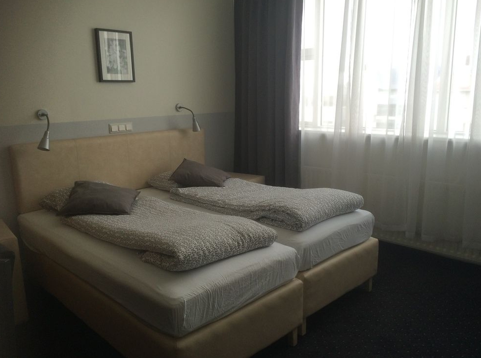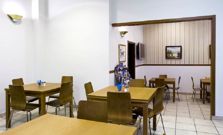 The hotel offers large (24-27 m2) single, double and triple rooms, as well as studio rooms. All rooms are equipped with twin beds, refrigerator, telephone, color TV and private bathrooms with shower. The studio rooms are additionally furnished with a kitchenette, which include a small cooking-stove and a microwave oven. One or two extra beds can be added in each room. The breakfast room is located on the ground floor, as well as a lounge and a bar.