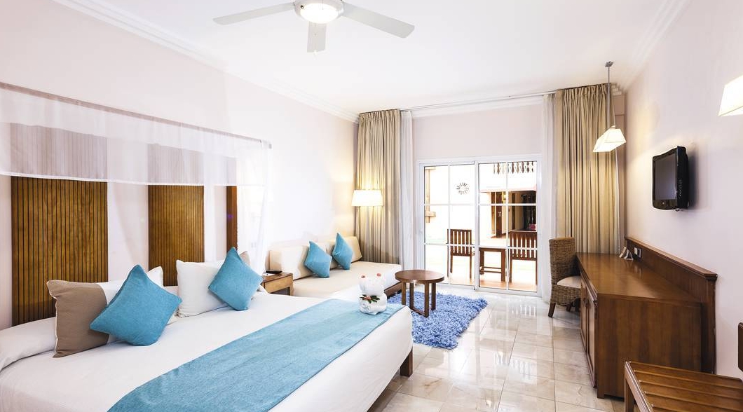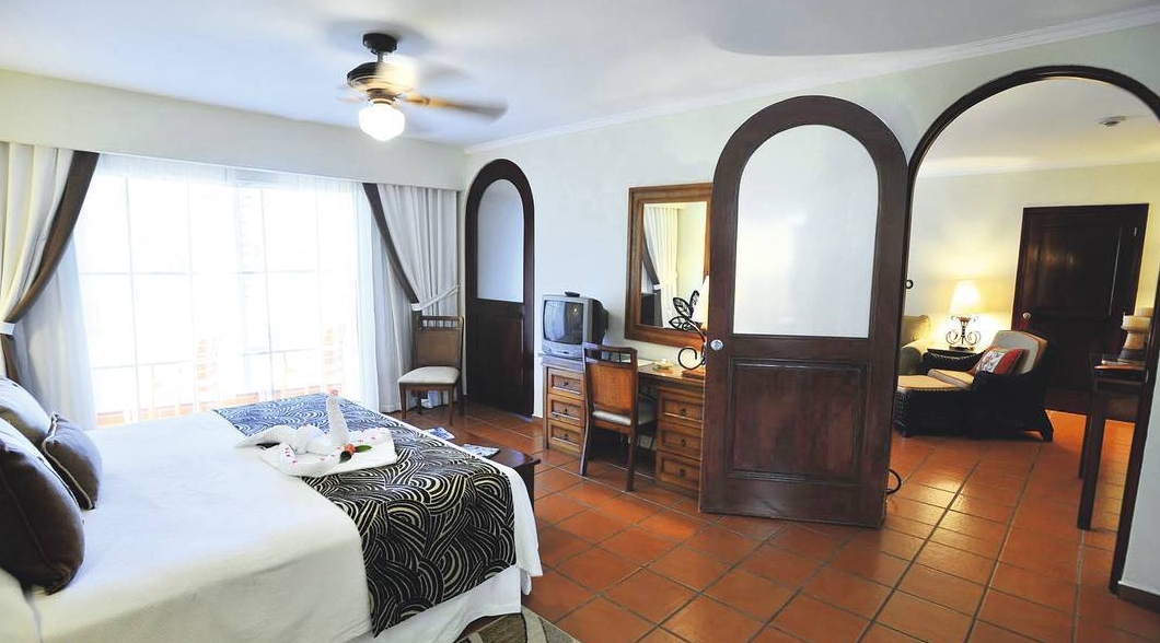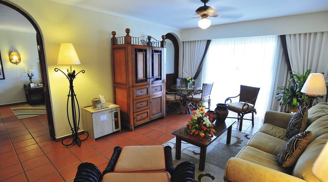 The hotel has a large swimming pool surrounded by palm trees with a backdrop of the mountains, perfect for relaxing by. Location Located on the beachfront, the hotel is less than twenty minutes away from the International Airport of Puerto Plata and less than one hour from the city of Santiago de Los Caballeros, well known for its fine cigars and old rum factories. Distance 7 kms to city centre 15 kms to the nearest airport (la union). The large air-conditioned bedrooms offer amenities such as hair dryer, coffee maker; iron and board; direct dial telephone; cable TV. Dining options offer five restaurants, one is buffet and there are four a la carte restaurants. There are four bars conveniently located in different areas of the resort including pool bars and a sports bar. Lobby The medium-size lobby has open sides and a high ceiling.