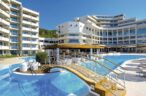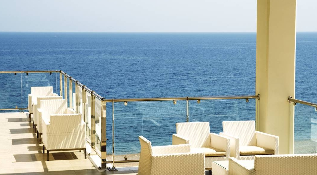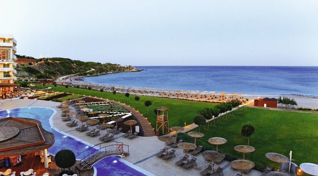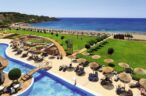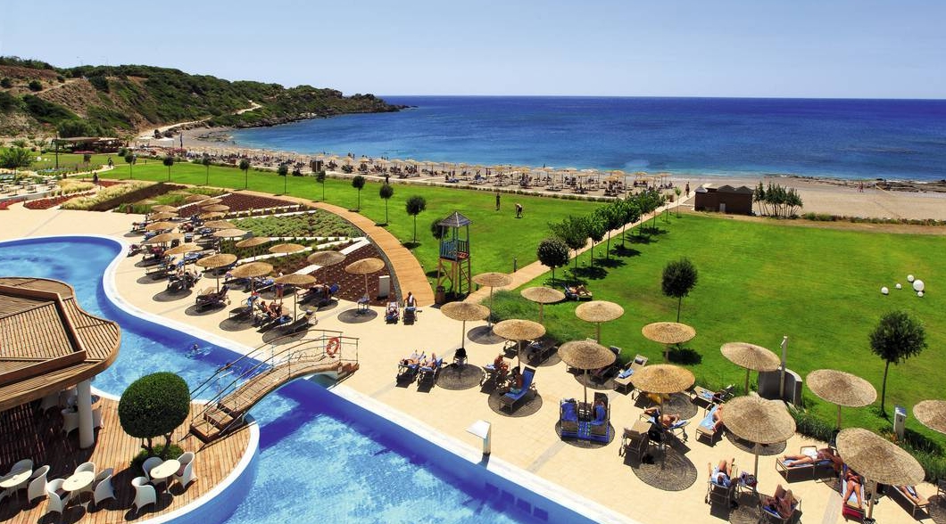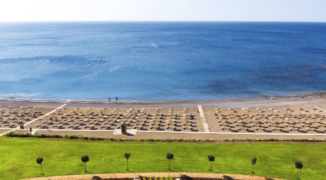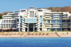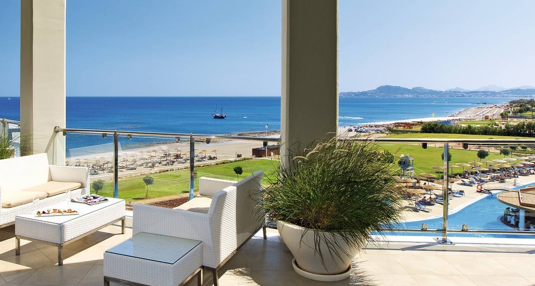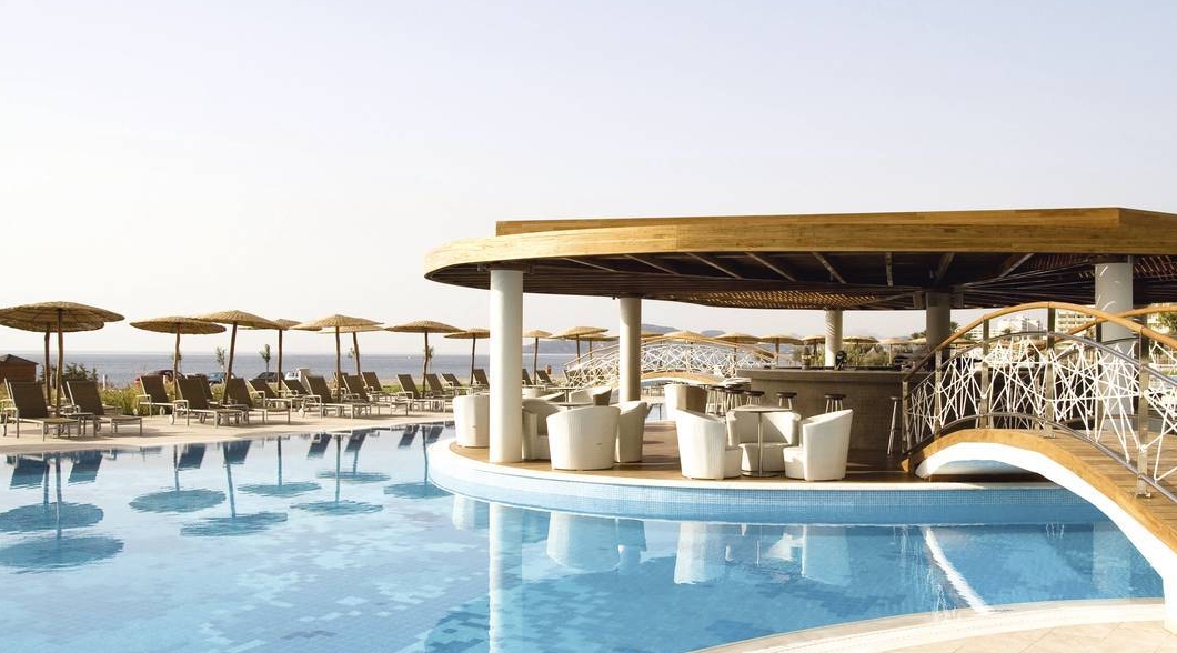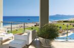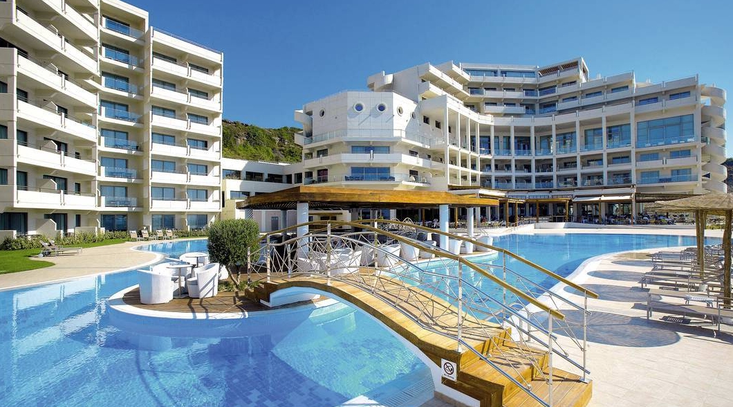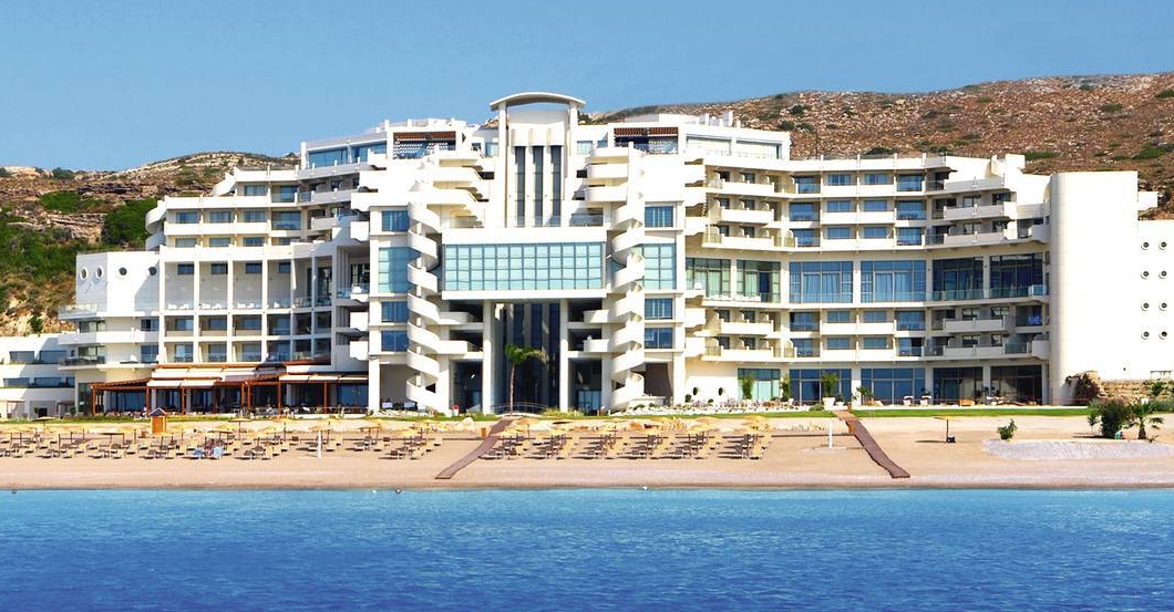 The hotel enjoys a perfect beachfront location. It is situated next to the famous monument of Kalithea Springs and within short walking distance from the island’s water park. There is also a bus stop in front of the hotel allowing fast transportation from and to Rhodes city which is 9 km away. The resort of Faliraki is at 4 km and the airport at 15 km.–This is a new 5-star deluxe beachfront hotel, built in 2008 and renovated in 2009, with a contemporary type of architecture in 3 separate buildings, an impressive atrium with 3 panoramic lifts and a large garden lagoon on the ground level. This air-conditioned design hotel features a total of 327 rooms. Guests are welcomed into a lobby with 24-hour reception and check-out service. There are a range of facilities at the hotel, including a newspaper stand, games room, TV lounge and currency exchange facilities. The hotel has its own café, bar and 3 restaurants. Conference facilities are available for business guests as well as WLAN Internet access (fees apply). Room and laundry services are also featured (fees apply).