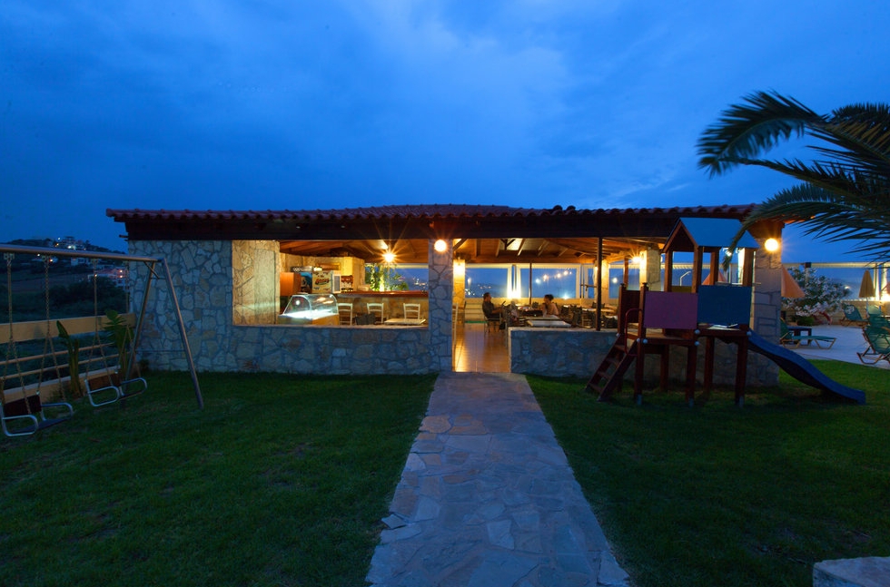 The apartment complex Top Hotel is situated on a hill only 300 m from the sandy beach in the village Agia Marina, 8 km west of Chania town. Not far from the village Platanias and 25 km from Chania airport (150 km/Heraklion). Within the complex facilities include reception service 24h, outdoor swimming pool with children s section, sun terrace, playground, snack bar and parking. The apartments are equipped with bathroom/shower, kitchenette, fridge, safe (extra charge), telephone, TV and air conditioning.,Sofa Bed in the living room for the 3rd/4th person. – The hotel has a private path to the beach appropriate for walking only. – Cleaning 6 days/week, change of towels 2 days/week, bed sheets 2 days/week.